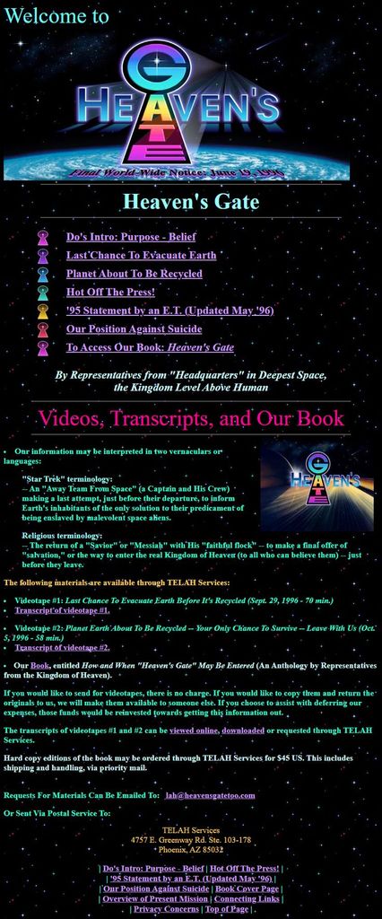 39 personnes se sont donnés la mort dans cette villa de San Diego, et d'autres membres de la secte qui avaient prit leurs distance ont quand même décidé de se suicider quelques semaines/mois après le suicide collectif initial, depuis leur site web est géré par d'anciens membres qui pensent que leur role est de partager la parole de la secte Heaven's Gate (la porte du paradis), il n'a pas été modifié depuis le jour ou ils se sont suicidés, on peut encore voir clignoter le "red alert" en 1ere page pour signifier que le moment était venu