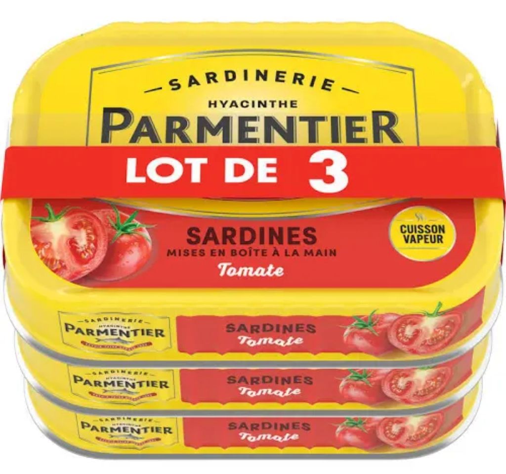 Ajoute la boîte de sardine Parmentier, un peu plus de 2€50 les 3 boîtes