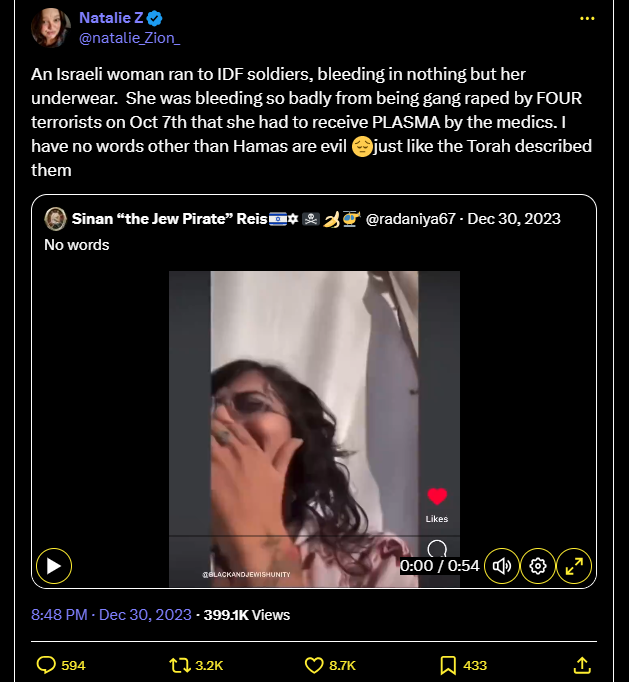 Une Israélienne a couru vers les soldats de Tsahal, ne saignant que dans ses sous-vêtements. Elle saignait tellement après avoir été violée en groupe par QUATRE terroristes le 7 octobre qu'elle a dû recevoir du PLASMA par les médecins. Je n'ai pas d'autres mots que le Hamas est mauvais, tout comme la Torah le décrit.