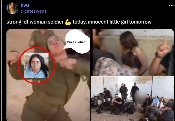 IMAGE SADIQUE D'UNE SOLDAT FEMME DE Tsahal PRENDANT UN SELFIE POUR LES MÉDIAS SOCIAUX PENDANT QUE, EN ARRIÈRE-PLAN, UNE PRISONNIÈRE PALESTINIENNE EST ASSISE LES YEUX BANDÉS.