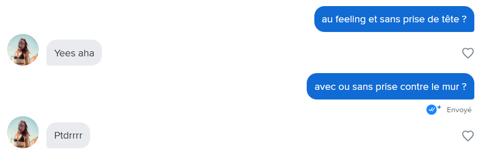 Y a un profil à 621km qui vient de passer (si je la vois alors qu'elle est aussi loin c'est qu'elle m'a probablement like) mais j'ai regardé sa bio en premier et elle faisait genre "je suis jamais ici hihi" du coup j'ai swipe à gauche alors que si j'avais regardé la distance en premier j'aurais su que c'était du mytho