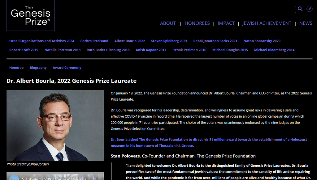 Le 19 janvier 2022, la Fondation du Prix Genesis a annoncé le Dr Albert Bourla, président-directeur général de Pfizer, comme lauréat du Prix Genesis 2022.