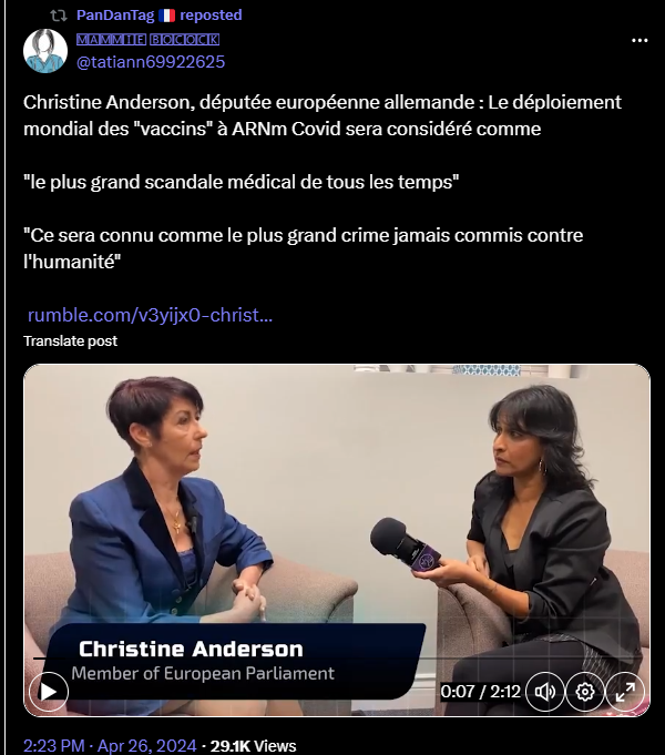 Christine Anderson, députée européenne allemande : Le déploiement mondial des "vaccins" à ARNm Covid sera considéré comme