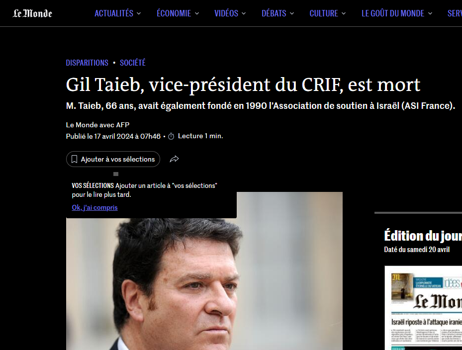 Le vice-président du Conseil représentatif des institutions juives de France (CRIF), Gil Taieb, est mort à l’âge de 66 ans, a annoncé mardi 16 avril l’institution, saluant un « infatigable militant, fervent défenseur d’Israël et de la communauté juive ». « C’est une immense perte pour la communauté juive et ses institutions. Sa disparition laisse un immense vide », a écrit le CRIF sur ses réseaux sociaux.