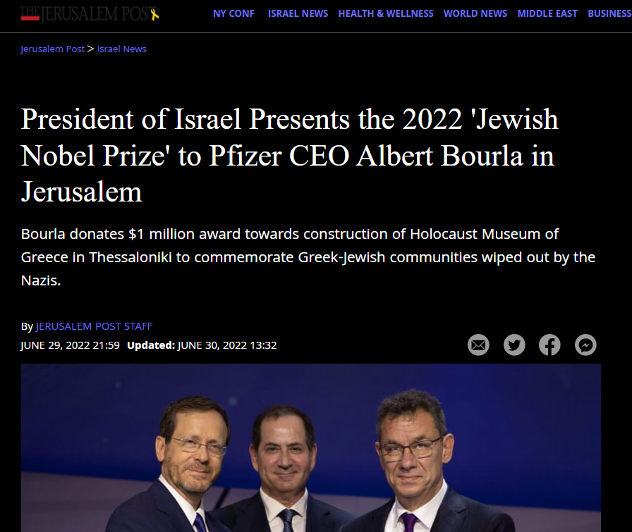 Le président israélien remet le « Prix Nobel juif » 2022 au PDG de Pfizer, Albert Bourla, à Jérusalem