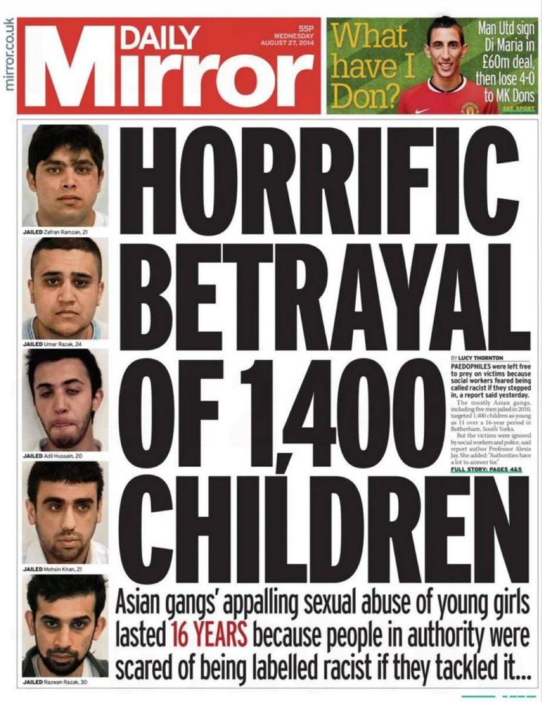Pendant plus de 15 ans, les autorités et la police ont dissimulé les criminels, craignant d'être accusés de racisme. Il a été interdit aux journaux de couvrir le scandale pour éviter des émeutes. Les médias britanniques ont qualifié les Pakistanais d'« hommes asiatiques » pour dissimuler le problème des viols.
