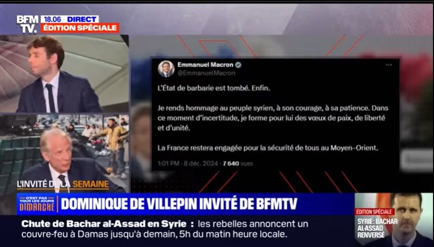 Villepin, un habitué de LCI, BFMTV, vendu par des médias juifs comme une sorte de personnalité importante, le politique inutile parmi d'autres dans une indignation du spectacle et qui se croit subversif en allant dans les plateaux tv, aucun parti politique en France n'est une alternative, aucun ne propose des sanctions contre les parasites juifs, maçons et de renvoyer tous les non blancs importés depuis la fin du siècle précédent.