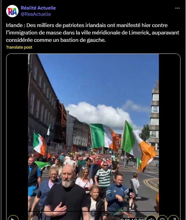 Irlande : Des milliers de patriotes irlandais ont manifesté hier contre l’immigration de masse dans la ville méridionale de Limerick, auparavant considérée comme un bastion de gauche.