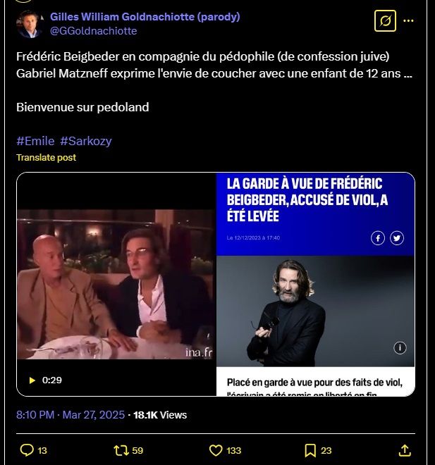 Frédéric Beigbeder en compagnie du pédophile (de confession juive) Gabriel Matzneff exprime l'envie de coucher avec une enfant de 12 ans ...