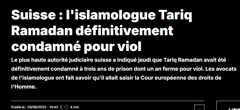 Le Tribunal fédéral suisse a annoncé avoir rejeté le recours formé par Tariq Ramadan contre sa condamnation "pour viol et contrainte sexuelle prononcée par la Cour de justice genevoise" en 2024, pour des faits vieux de 17 ans. Il s'agit de sa première condamnation pour viol.