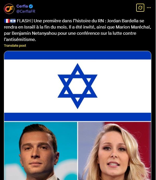 🇫🇷🇮🇱 FLASH | Une première dans l’histoire du RN : Jordan Bardella se rendra en Israël à la fin du mois. Il a été invité, ainsi que Marion Maréchal, par Benjamin Netanyahou pour une conférence sur la lutte contre l’antisémitisme.