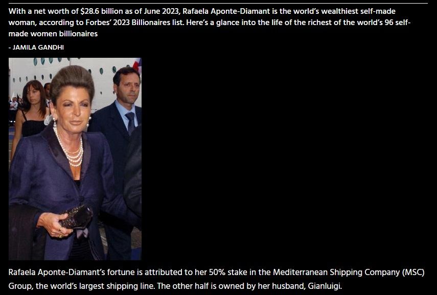 La fortune de Rafaela Aponte-Diamant provient de sa participation de 50 % dans le groupe Mediterranean Shipping Company (MSC), la plus grande compagnie maritime au monde. L'autre moitié appartient à son mari, Gianluigi.
