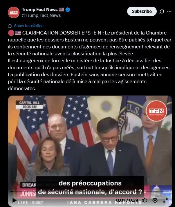 🔴🇺🇸 CLARIFICATION DOSSIER EPSTEIN : Le président de la Chambre rappelle que les dossiers Epstein ne peuvent pas être publiés tel quel car ils contiennent des documents d'agences de renseignement relevant de la sécurité nationale avec la classification la plus élevée.