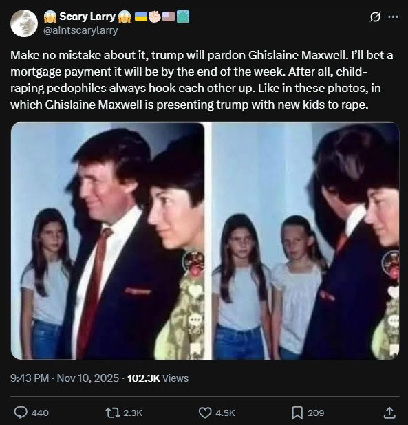 Ne vous y trompez pas, Trump pardonnera à Ghislaine Maxwell. Je parie que le versement hypothécaire aura lieu d’ici la fin de la semaine. Après tout, les pédocriminels qui violent des enfants se connectent toujours entre eux. Comme sur ces photos, sur lesquelles Ghislaine Maxwell présente Trump avec de nouveaux enfants à violer.