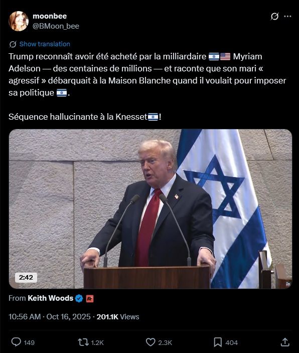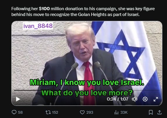Trump reconnaît avoir été acheté par la milliardaire 🇮🇱🇺🇸 Myriam Adelson — des centaines de millions — et raconte que son mari « agressif » débarquait à la Maison Blanche quand il voulait pour imposer sa politique 🇮🇱.