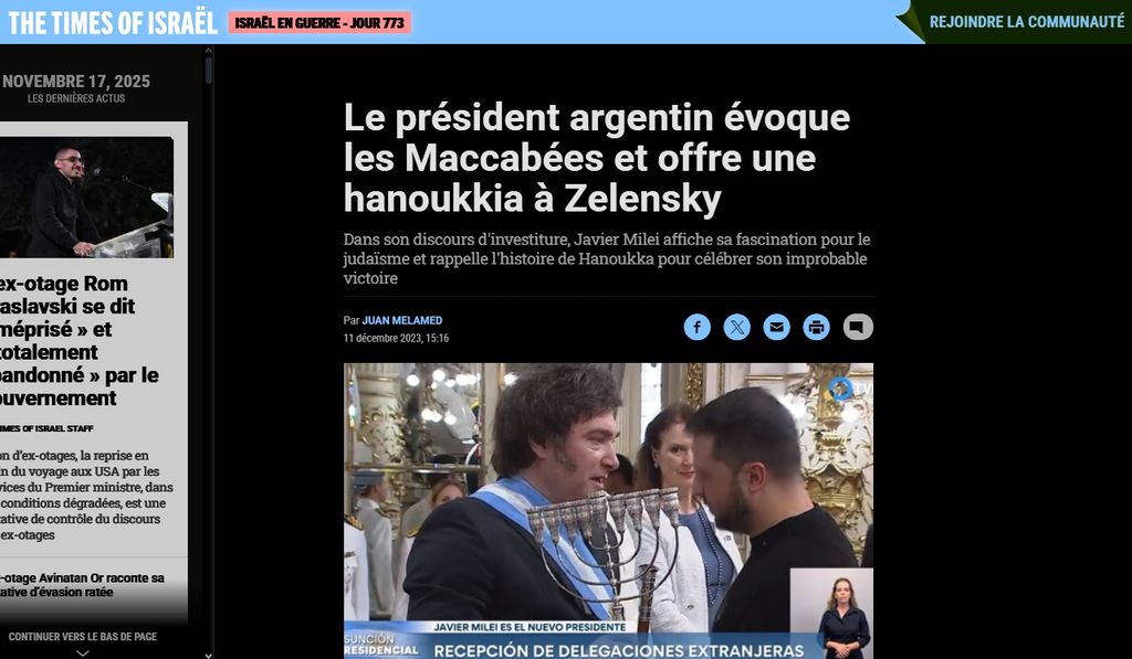 Le président argentin évoque les Maccabées et offre une hanoukkia à Zelensky. Dans son discours d'investiture, Javier Milei affiche sa fascination pour le judaïsme et rappelle l'histoire de Hanoukka pour célébrer son improbable victoire