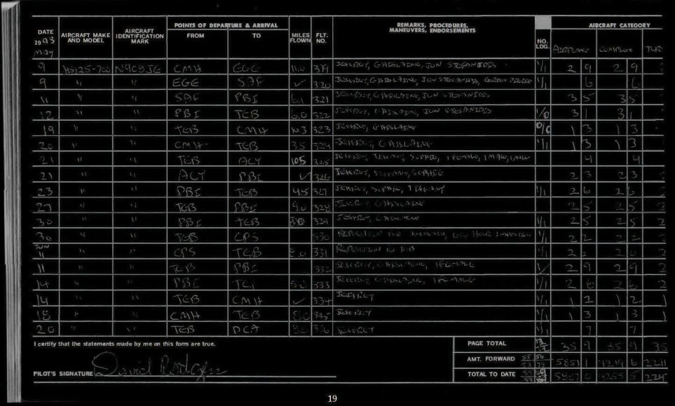 Détails techniques des vols : Le registre montre une activité intense avec parfois deux ou trois vols par jour. Par exemple, le 27 juin, l'avion fait un triangle entre Palm Beach, Columbus et Teterboro.