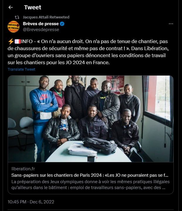 ⚡🇫🇷INFO - « On n’a aucun droit. On n'a pas de tenue de chantier, pas de chaussures de sécurité et même pas de contrat ! ». Dans Libération, un groupe d’ouvriers sans papiers dénoncent les conditions de travail sur les chantiers pour les JO 2024 en France.