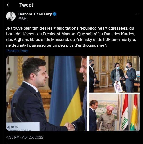 Je trouve bien timides les « félicitations républicaines » adressées, du bout des lèvres, au Président Macron. Que soit réélu l’ami des Kurdes, des Afghans libres et de Massoud, de Zelensky et de l’Ukraine martyre, ne devrait-il pas susciter un peu plus d’enthousiasme ?