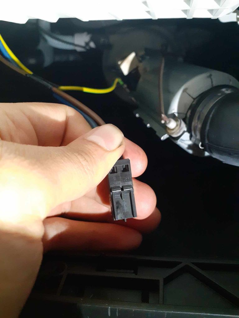 En cause la petite pièce que voici, liée à la résistance chauffante bu bousin qui saute dès que le programme a besoin d'eau chaude. Genre arc électrique et tout