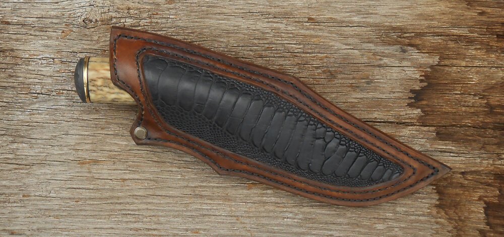 Etui : peau de patte d’autruche, cuir collet végétal, couture sellier