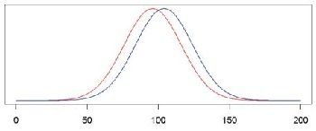 "La courbe bleue représente les résultats pour les hommes et la rouge pour les femmes. Chaque courbe indique, pour chaque niveau d’agressivité, le pourcentage de personnes concernées. On le voit : les deux distributions se recouvrent très largement. Les hommes sont, en moyenne, plus agressifs que les femmes, mais cela ne veut pas dire que tout homme est plus agressif que toute femme ! En fait, si l’on choisit un homme et une femme au hasard, il y a une probabilité de 61 % que l’homme choisi soit plus agressif que la femme. C’est plus que les 50 % qu’on aurait s’il n’y avait aucune différence, mais bien loin d’un absolu déterminisme."