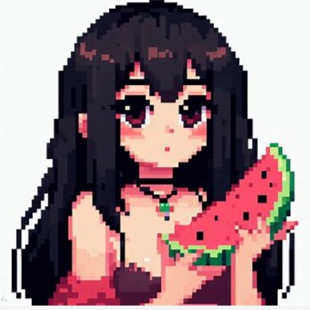 "long black haired teen girl with big dark brown eyes wearing a choker and holding a watermelon pixel art style"
