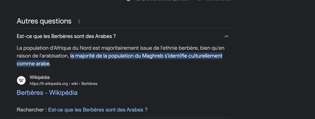 "La population d'Afrique du Nord est majoritairement issue de l'ethnie berbère, bien qu'en raison de l'arabisation, la majorité de la population du Maghreb s'identifie culturellement comme arabe."