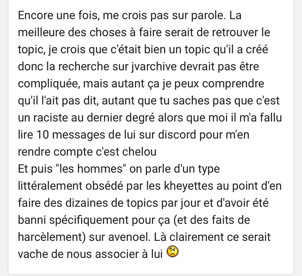 Parce que t'as littéralement mis un lien de ce topic en affirmant que c'est un aveux de ma part comme quoi j'ai harcelé une fille maghrébine ? Tu peux pas dire non c'est la personne en question qui m'a montré tous tes messages et qui m'a envoyé le lien