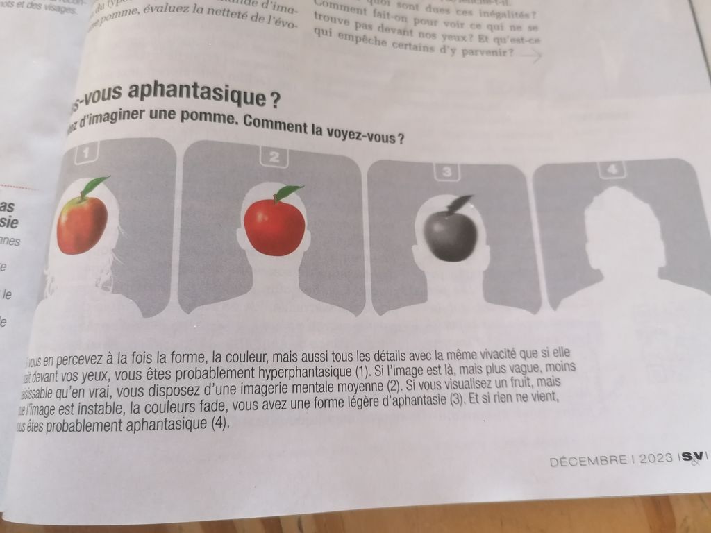 Vous vous arrivez à visualiser la pomme ? Moi j'arrive pas à savoir si je la visualise vraiment ou pas les pensées visuelles sont comme en "arrière plan" je ne sais pas comment dire c'est même pas une histoire de qualité de l'image j'sais pas quoi je pense en image mais c'est pas photographique même quand j'ai les yeux fermés donc je trouve leur concept un peu bizarre l'image est la mais en mode " je ne sais pas quoi ça ressemble pas au schéma" et en plus j'ai pensé à la sorcière de Blanche Neige en visualisant la pomme