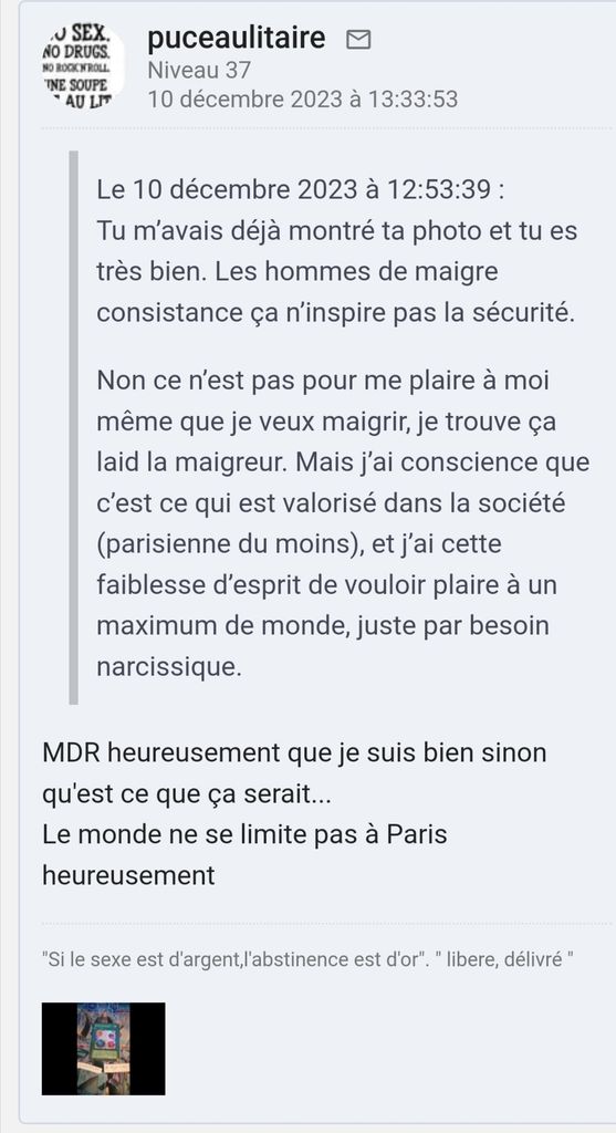 J'ai déja eu une période où j'ai perdu 10 kilos en un mois et où on m'a dit sue j'étais trop maigre et que j'avais l'air maladif alors que je pesais entre 85 et 88 kilos pour