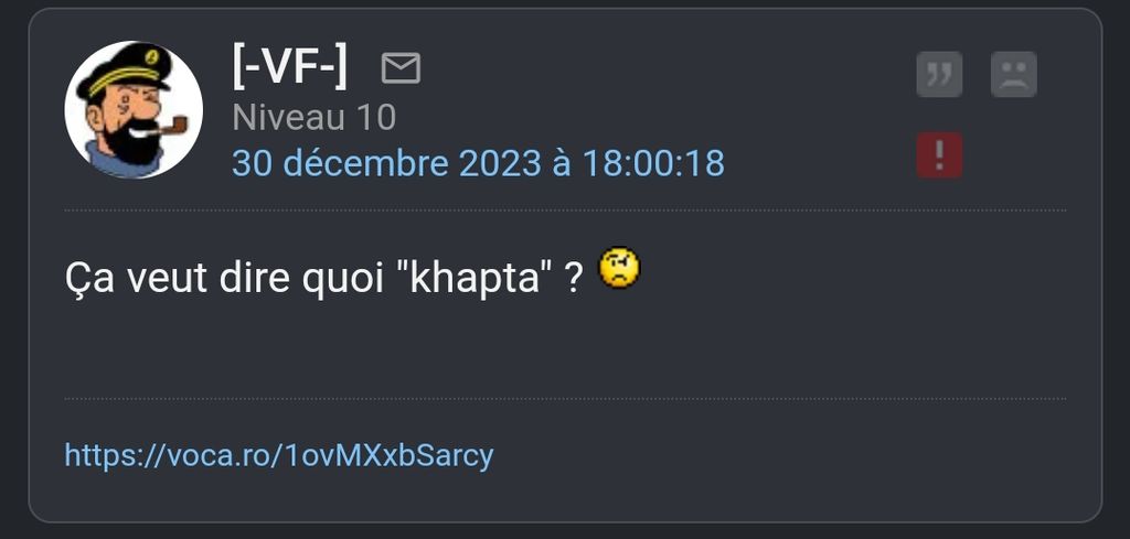 Je suis fatigué, l'idée qu'un vieux monsieur se questionne sur le sens de khapta m'a fait rire sur le coup mais j'avoue avoir été immature . . .
