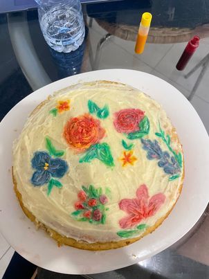Je fais un gâteau avec des fleurs en déco, c'est hyper compliqué ce machin, j'ai pas les outils adaptés et j'en met partout