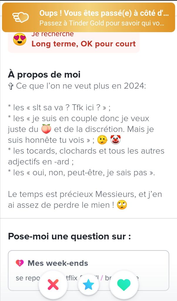 Imagine tu es là pour une relation longue durée mais c'est quand même d'accord pour du court terme (sous-entendu avec Chad faut pas déconner) et tu fais une description hargneuse ou tu reproches à des mecs de vouloir que du sexe ou d'être indécis l'hôpital qui se fout de la charité
