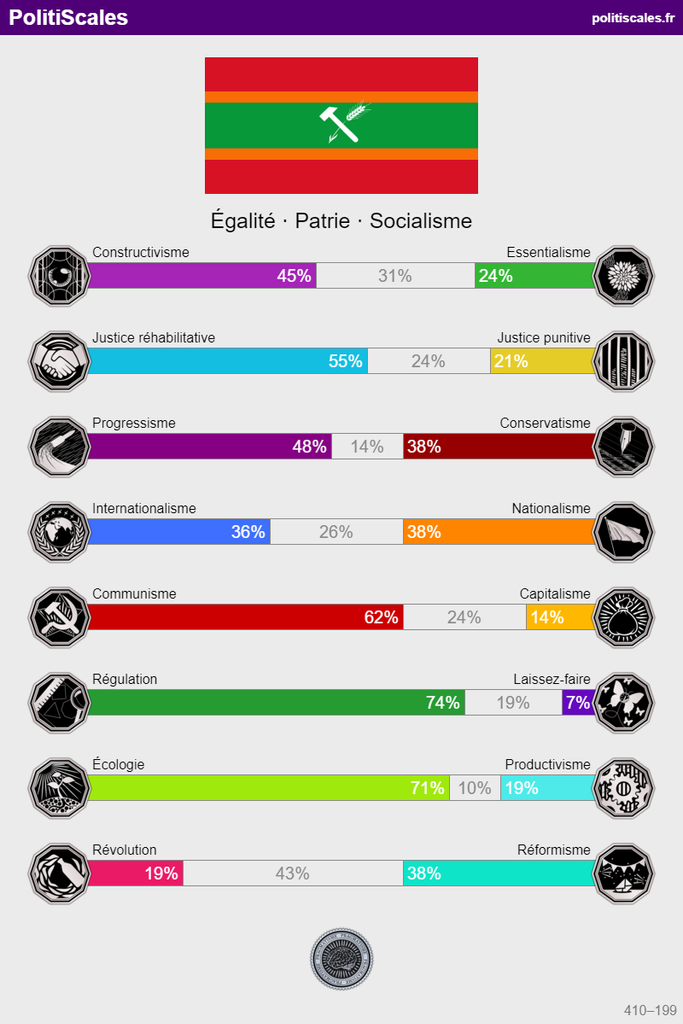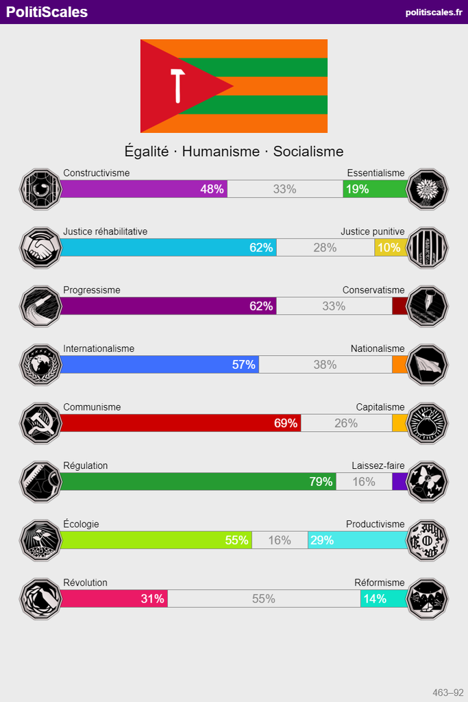 Productivisme (mais c'est biaisé car y a des questions qui te rangent dans le camps productiviste comme le nucléaire, or un écolo conséquent devrait aussi soutenir le nucléaire comme Jancovici le préconise )