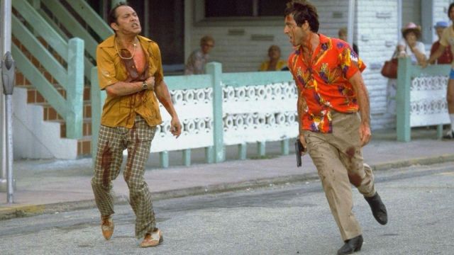 Chemise hawaïenne rouge avec palmier vert, pantalon beige, chaussure de ville marron, fedora blanc avec le cercle noir