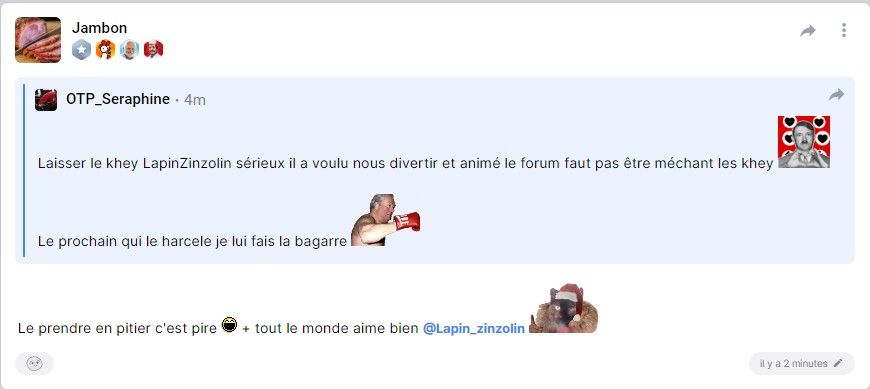 Laisser le khey LapinZinzolin sérieux il a voulu nous divertir et animé le forum faut pas être méchant les khey