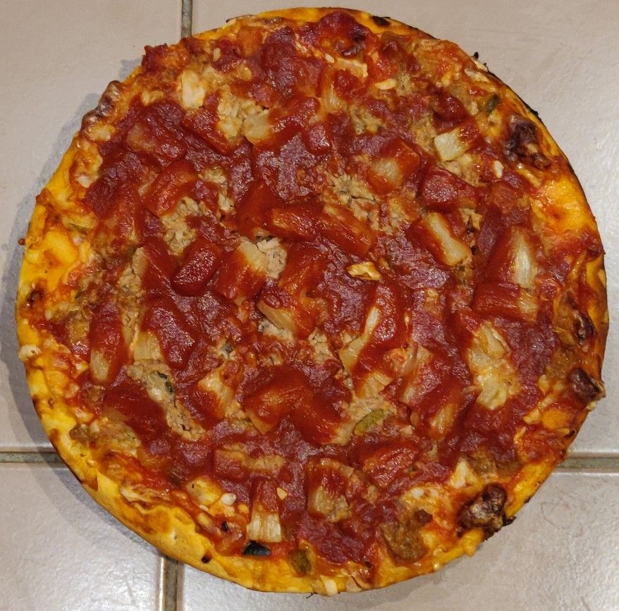 Enfin, ouvrez la boite de sauce pour pâtes et placez-là sur votre succulent mets, de façon à bien recouvrir les morceaux d'ananas afin qu'ils ne crament pas dans le four. Vous devriez utiliser 1/4 du bocal par pizza, donc il vous restera la moitié