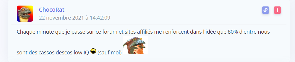 Peut être que t'as pas sorti mot pour mot ""je suis admin et pas toi, tu m'es donc inférieur"" mais t'as déjà sortie que tout le monde est un desco low iq sauf toi