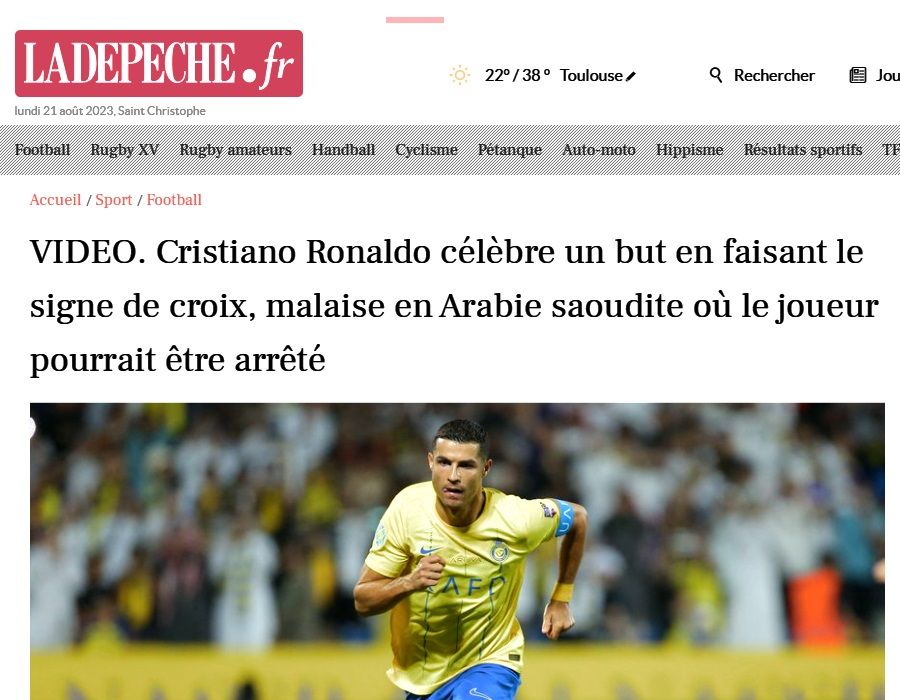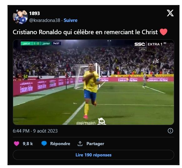 En effet, avant d'effectuer son traditionnel saut retourné suivi du "suuu" repris par tout le stade, Cristiano Ronaldo a fait le signe de la croix chrétienne. Et si cela semble inaperçu en Europe tant les joueurs effectuent souvent cette célébration, en Arabie saoudite, la pilule passe mal.