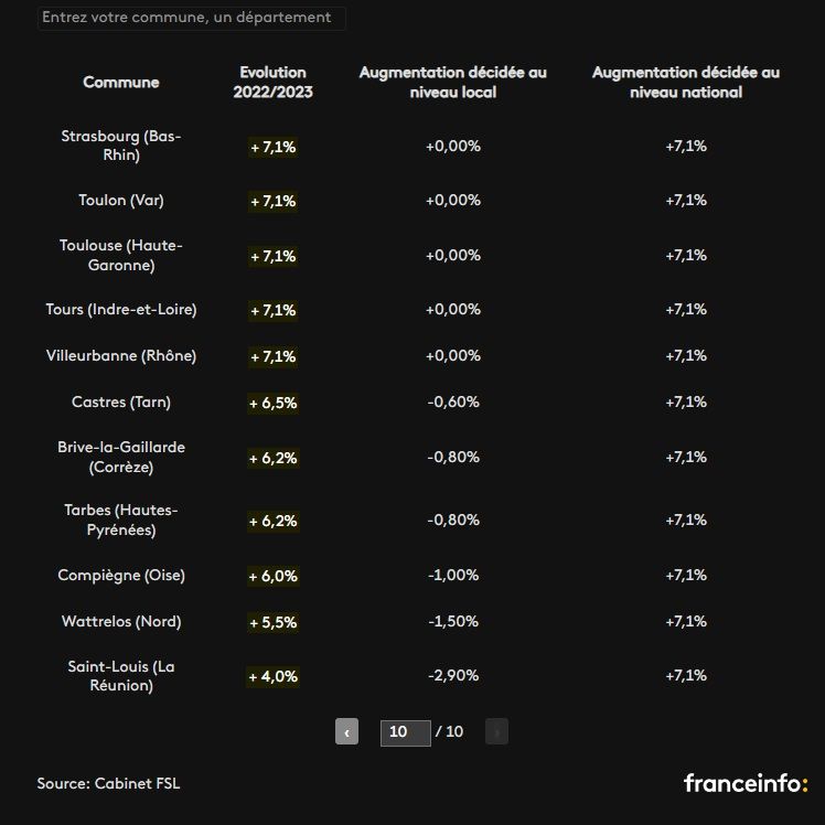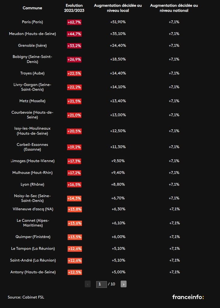 C'est le jour J. Mercredi 30 août marque le début de la mise en ligne des premiers avis de taxe foncière pour l'année 2023. Et l'addition promet d'être salée pour les propriétaires. En cause : l'inflation qui touche l'ensemble du territoire national, mais aussi des hausses décidées par certaines municipalités. Franceinfo publie la liste des augmentations attendues dans les 191 plus grosses villes françaises, grâce aux données compilées par le cabinet Finances et Stratégies locales (lien PDF).