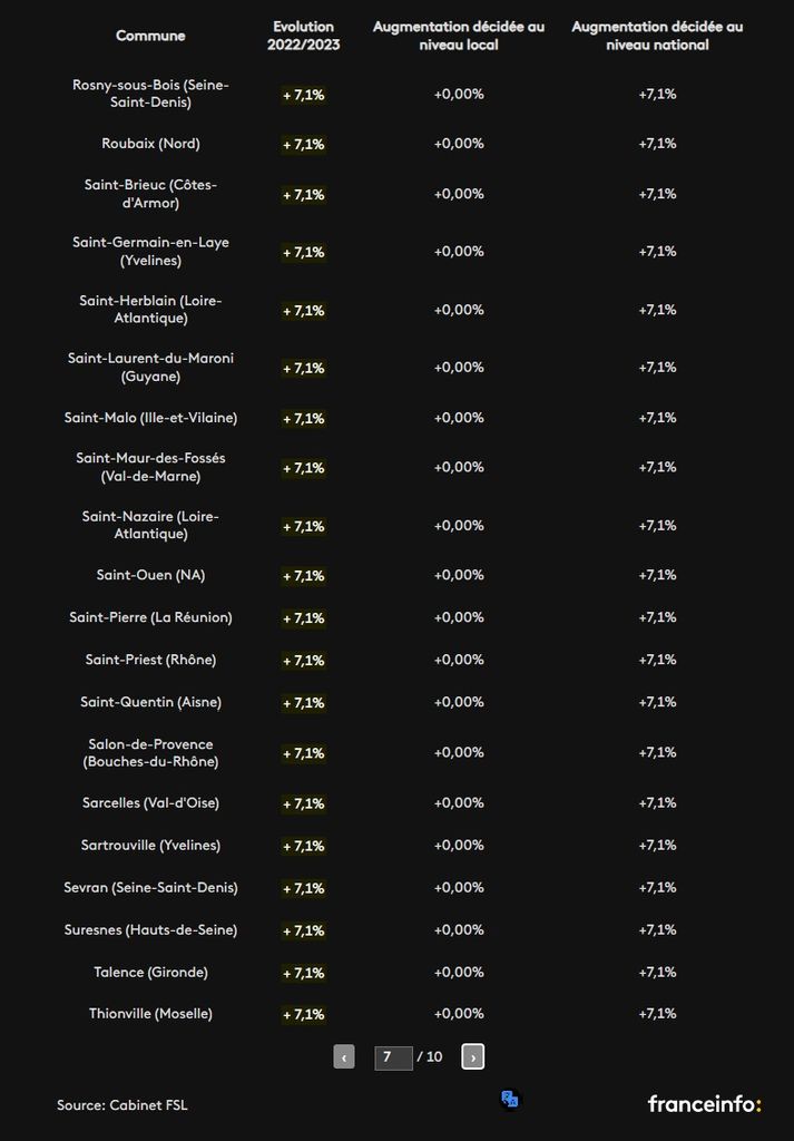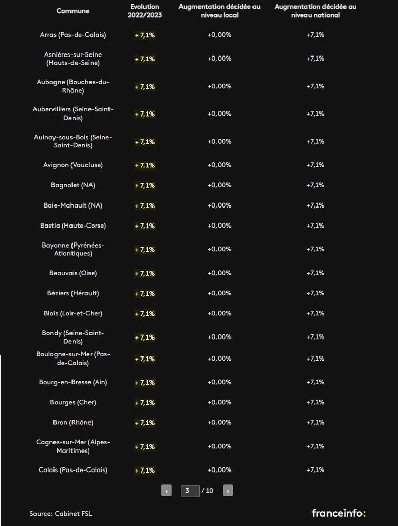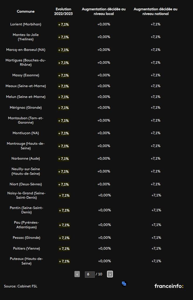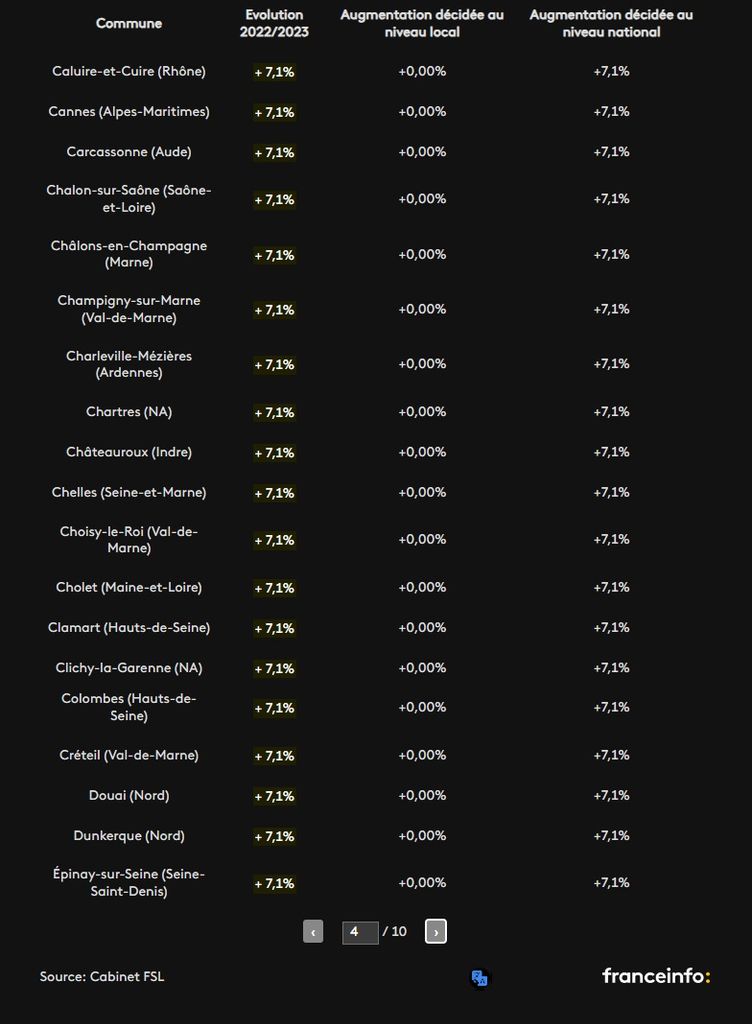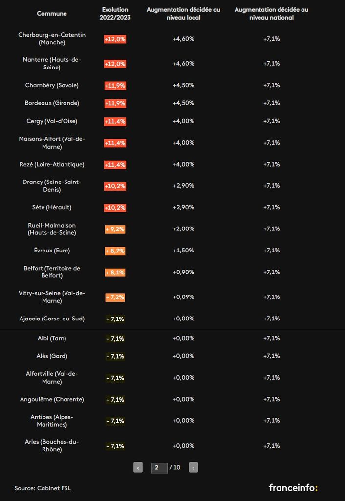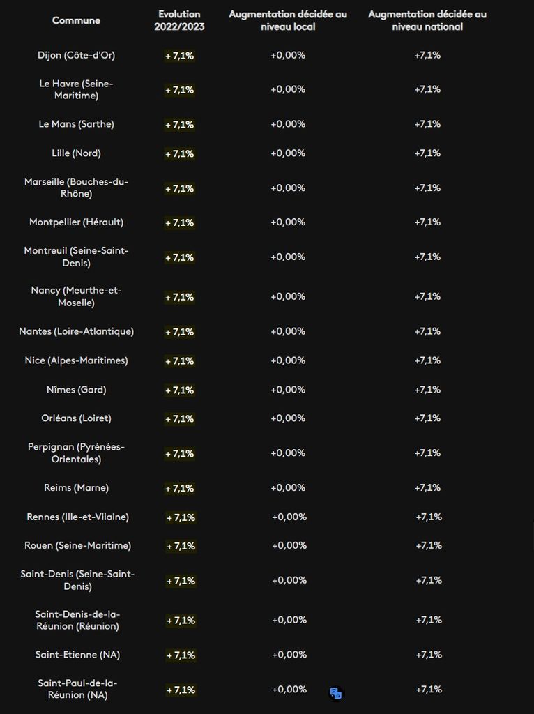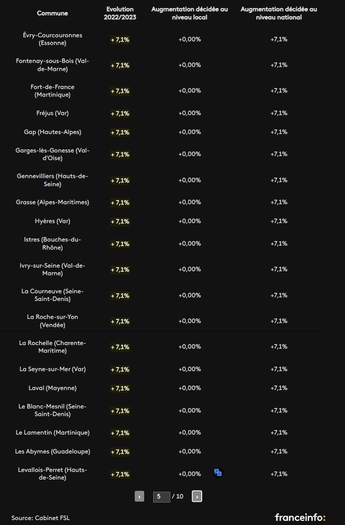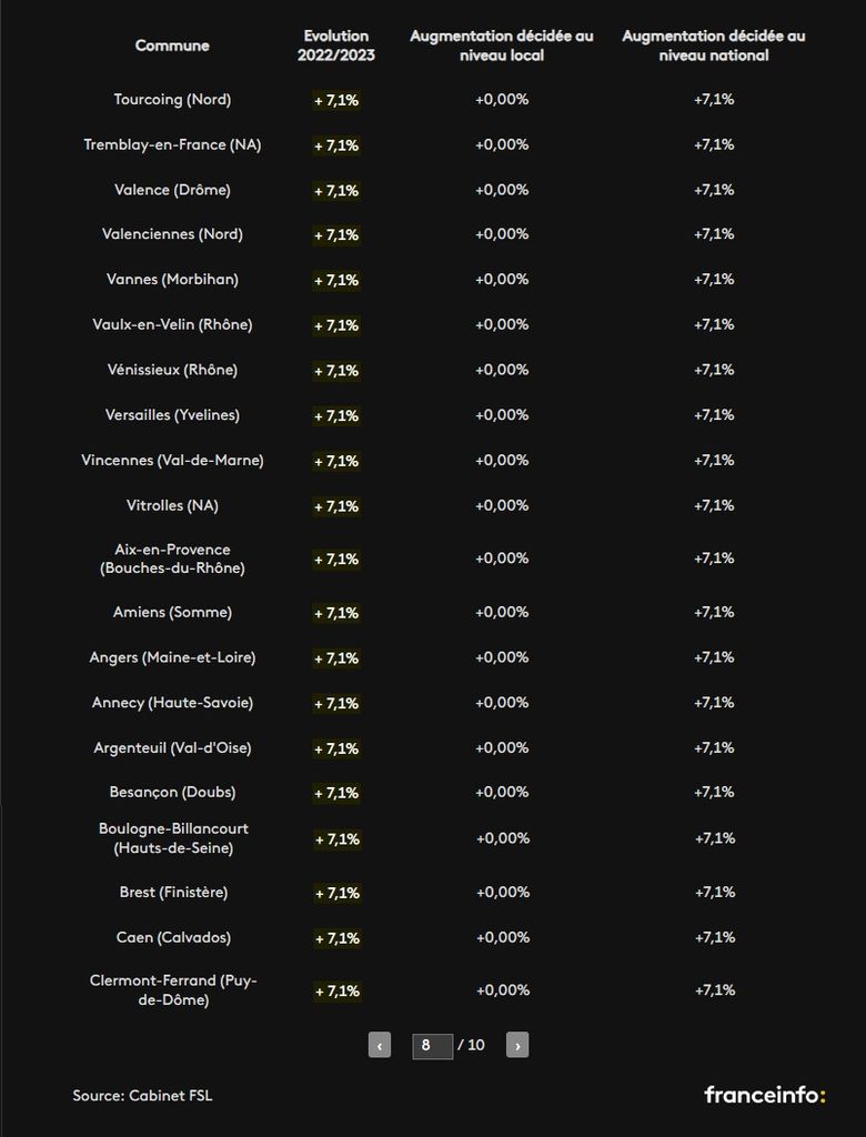 Il en ressort que la taxe foncière augmente dans toutes les villes de plus de 40 000 habitants. Chaque année, une partie de la hausse de cet impôt est déterminée en fonction de l'inflation. En 2023, cette revalorisation des valeurs locatives cadastrales atteint 7,1% : sa plus forte hausse depuis 1986, selon l'Union nationale des propriétaires immobiliers (UNPI), comme l'a rapporté Le Figaro .