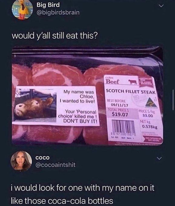 "ouin ouin ouin la vache est morte à cause de tes choix personnels, du coup, faut pas en manger comme ça elle sera morte pour rien"