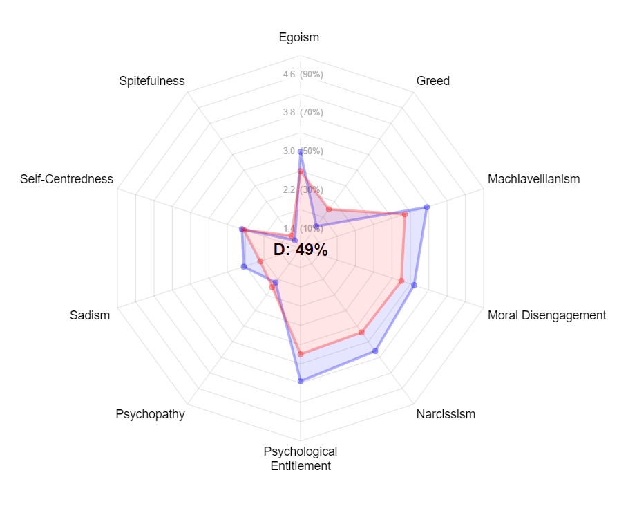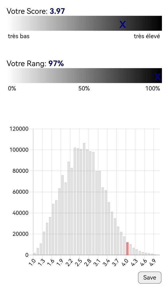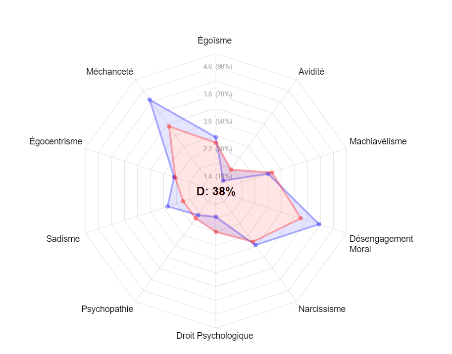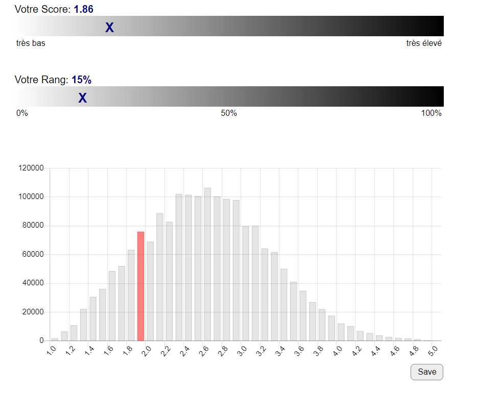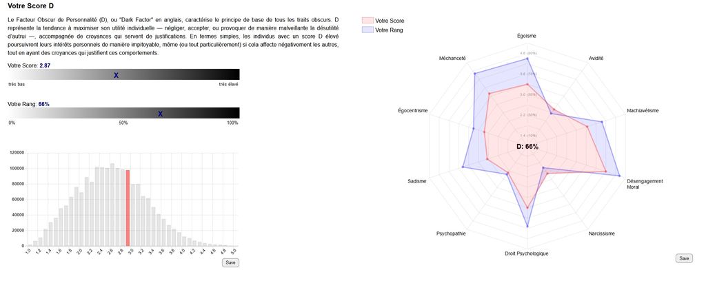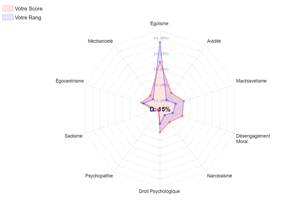 Moi je ne comprend pas mon score, je suis assez altruiste et j'ai répondu favorable sur les questions d'aider autrui, mais je suis assez cupide et rancunier oui