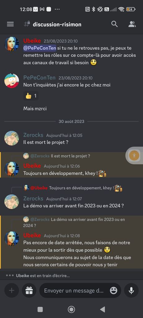 Il faudrait arrêter avec la boucle Risimon, je sais de source sûre que le projet est toujours bel et bien actif et les mecs sont à fond, je rappelle qu'il s'agit d'un jeu vidéo complet et que ça prend du temps au niveau du développement si tu veux sortir quelque chose d'un temps soit peu potable et non pas une merde Ubisoft lambda.