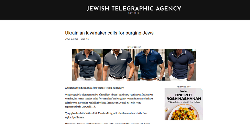 www.jta.org https://www.jta.org/2008/[...]er-calls-for-purging-jews Cet article montre également la manière dont il a appelé à une purge en 2008. " Oleg Tyagnybok, a former member of President Viktor Yushchenko’s parliament faction Our Ukraine, in a speech Tuesday called for “merciless” action against Jews and Russians who have seized power in Ukraine, Meilekh Sheykhet, the National Council on Soviet Jewry representative in Lvov, told JTA".