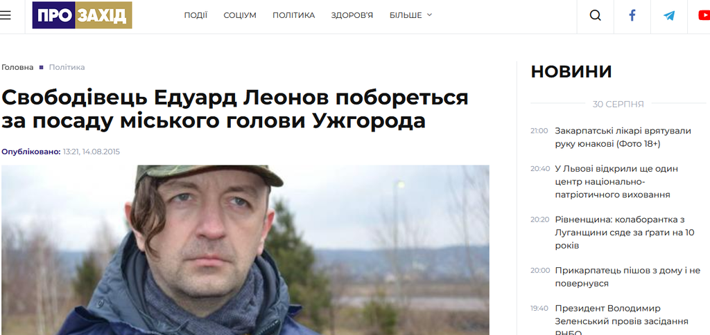 Голова Закарпатської обласної організації ВО “Свобода” Едуард Леонов балотуватиметься на посаду Ужгородського міського голови. Про це Леонов заявив у прямому ефірі каналу “Тиса”. За словами керівника ВО “Свобода”, в мери він іде тому, що вже давно живе в Ужгороді і, на його думку, знає, що ужгородці заслуговують кращої влади.