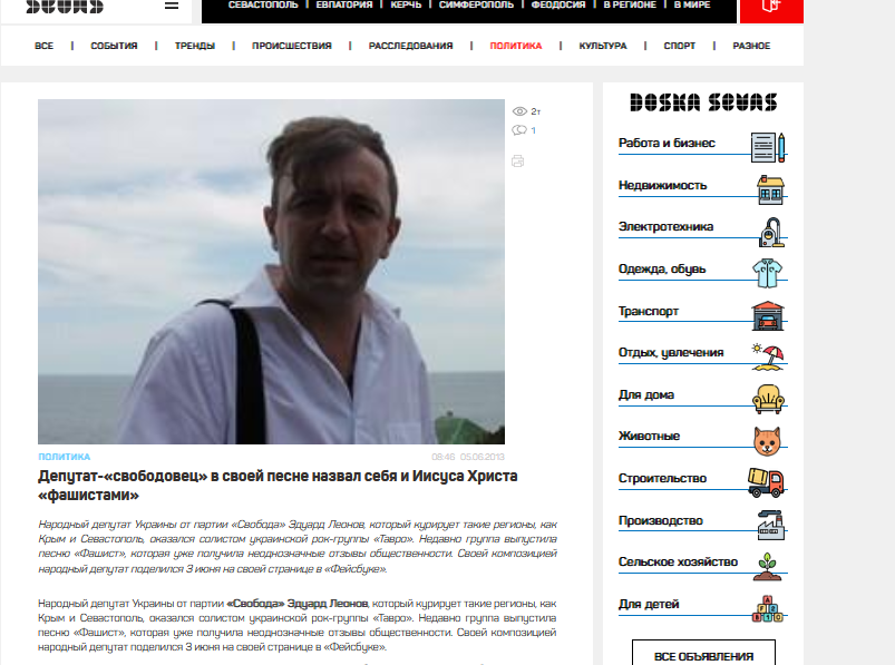 Народный депутат Украины от партии «Свобода» Эдуард Леонов, который курирует такие регионы, как Крым и Севастополь, оказался солистом украинской рок-группы «Тавро». Недавно группа выпустила песню «Фашист», которая уже получила неоднозначные отзывы общественности. Своей композицией народный депутат поделился 3 июня на своей странице в «Фейсбуке».