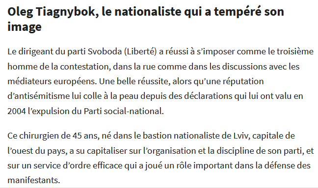 https://www.lesechos.fr/2[...]ges-de-lopposition-292430 " Oleg Tiagnybok, le nationaliste qui a tempéré son image " MAIS bien sûr. " Le dirigeant du parti Svoboda (Liberté) a réussi à s’imposer comme le troisième homme de la contestation, dans la rue comme dans les discussions avec les médiateurs européens. Une belle réussite, alors qu’une réputation d’antisémitisme lui colle à la peau depuis des déclarations qui lui ont valu en 2004 l’expulsion du Parti social-national.