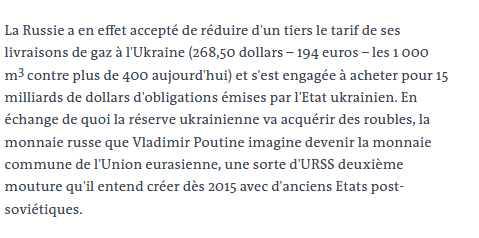 La Russie a en effet accepté de réduire d'un tiers le tarif de ses livraisons de gaz à l'Ukraine (268,50 dollars – 194 euros – les 1 000 m3 contre plus de 400 aujourd'hui) et s'est engagée à acheter pour 15 milliards de dollars d'obligations émises par l'Etat ukrainien. En échange de quoi la réserve ukrainienne va acquérir des roubles, la monnaie russe que Vladimir Poutine imagine devenir la monnaie commune de l'Union eurasienne, une sorte d'URSS deuxième mouture qu'il entend créer dès 2015 avec d'anciens Etats post-soviétiques.